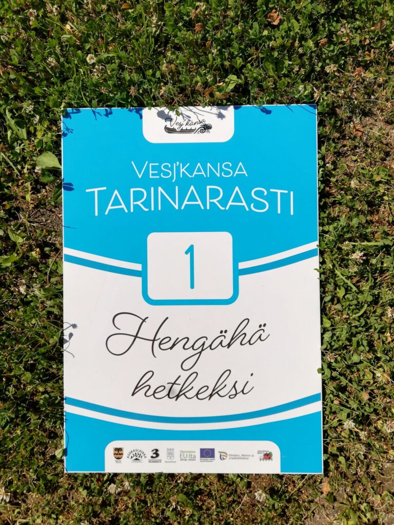 Vesj´kansan tarinarastit löydät Google Maps -kartan avulla ja tunnistat oheisestä kyltistä. Kyltin alapuolella on QR -koodi, joka ohjaa kuuntelemaan kyseiseen rastiin liitetyn pienen tarinan.