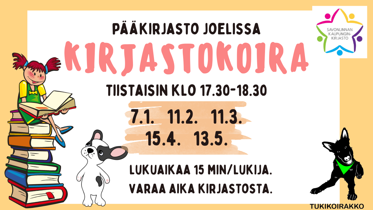 Kirjastokoirat ovat ihan oikeita koiria, jotka vierailevat pääkirjasto Joelissa kerran kuussa. Syksyn 2025 vierailupäivät ovat 19.8., 16.9., 14.10., 11.11. ja 9.12. Koirat kuuntelevat lukijoita Tilkku-tilassa klo 17.30-18.30. Koirille kannattaa varata etukäteen lukuaika, joka on 15 min/lukija. Tervetuloa!