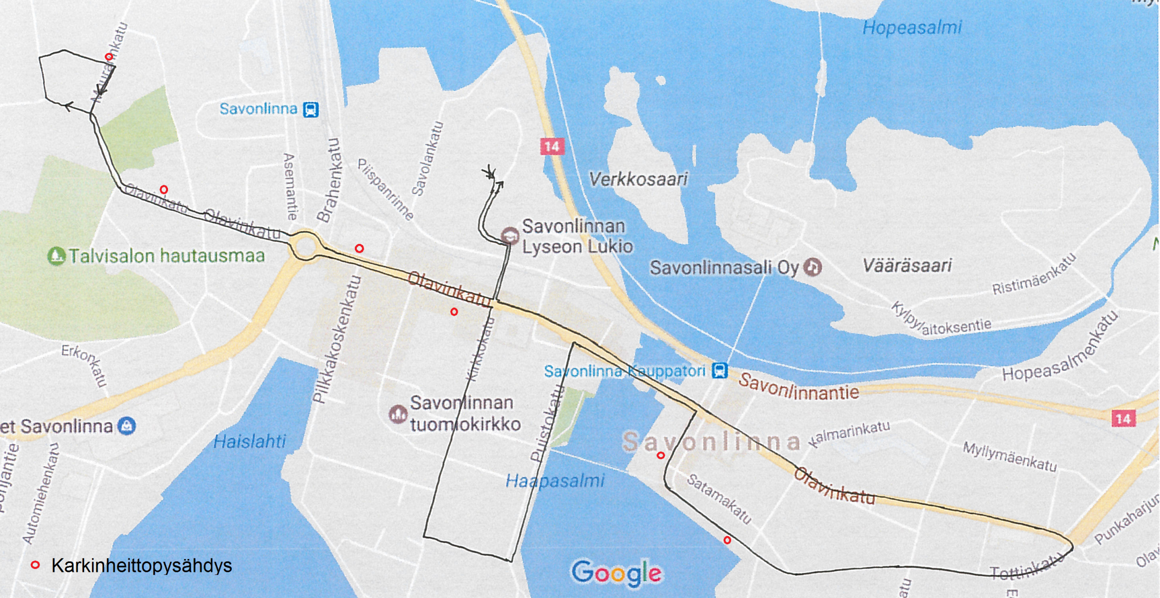 Lyseo – Olavinkatu – Talvisalon koulu (Talvisalon koululla sisään Silittäjänkadun puolelta) – Olavinkatu – Kirkkokatu – Savonniemenkatu – Puistokatu – Olavinkatu – Matkustajasatama – Tottinkatu – Viiskulma – Olavinkatu – Lyseo / Taidelukio