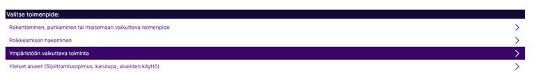 HUOMIOITHAN, että Lupapisteessä tulee kohteen (kiinteistön) valinnan jälkeen valita toimenpiteeksi ”Ympäristöön vaikuttava toiminta” (ks. kuva alla). Tämän jälkeen pääset valitsemaan tarkemmin, mitä ympäristöasiaa koskien haluat asioida Savonlinnan ympäristönsuojeluviranomaisen kanssa.
