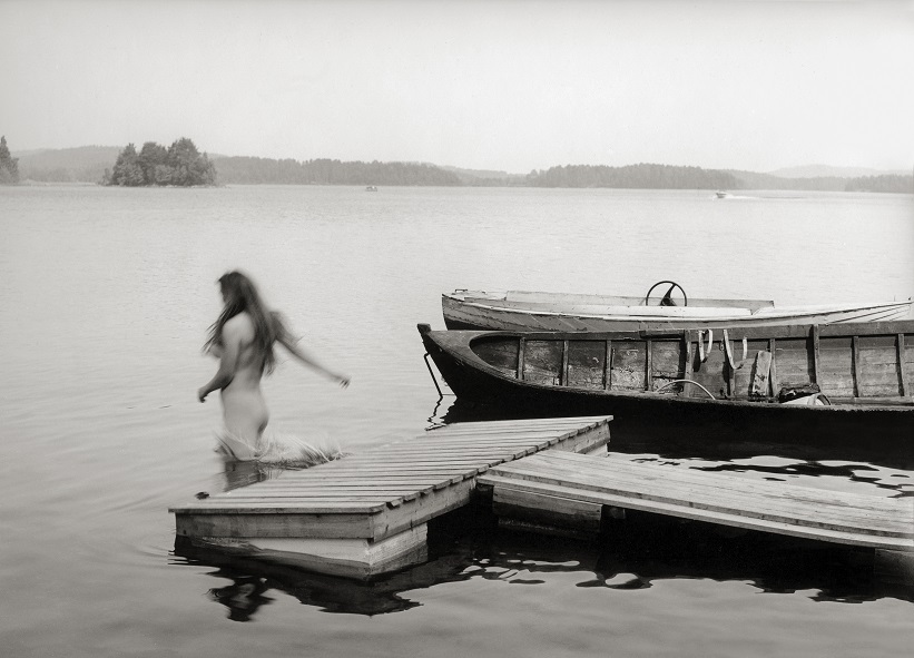 Luonto on vettä, vedessäoloa, Saimaan sadepäiviä ja lämpöä hehkuvia rantakallioita. Vesi ja siihen Jaskarin kuvissa usein yhdistyvä alastomuus luovat mielikuvia ajattomuudesta ja kadonneesta paratiisista.
