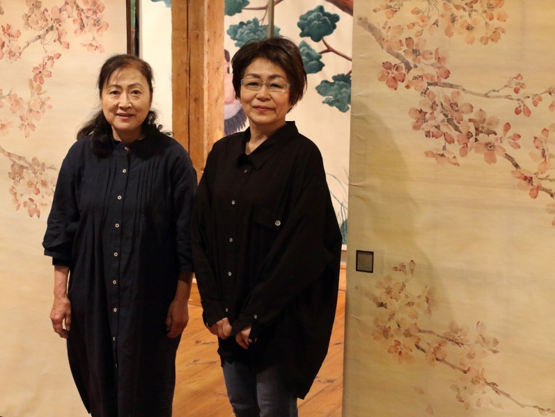 Kuvassa silkki- ja paperikukkataiteilija Yuko Sato (vas.) sekä näyttelyn fusumapaperimaalaukset tehnyt Yoshiko Shimada.