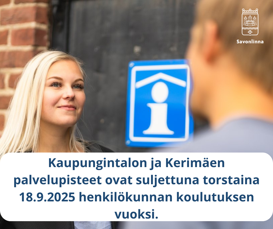 keskiviikkona 17. syyskuuta 2025Kaupungintalon ja Kerimäen palvelupisteet ovat suljettuna torstaina 18.9.2025 henkilökunnan koulutuksen vuoksi.