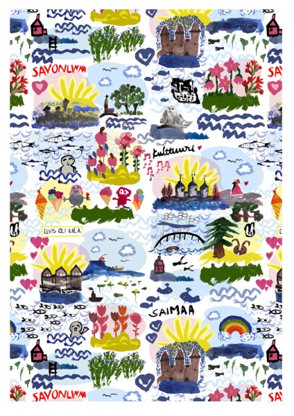 Työpajaan osallistuneet saivat maalata mitä tahansa heille tulee mieleen Savonlinnasta. Työpajan tuotoksista Yhdessä kuosissa -toiminnan suunnittelija Elina Laitinen on koostanut Savonlinnalle oman painokuosin.