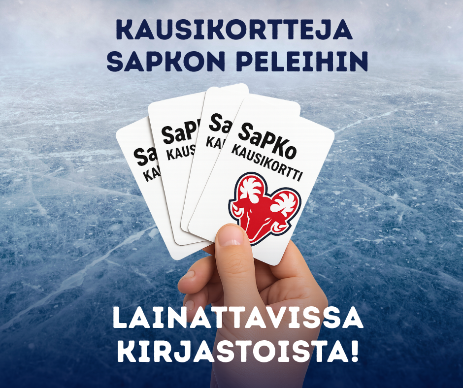 tiistaina 14. lokakuuta 2025Pääkirjasto Joelissa, Kerimäen kirjastossa, Punkaharjun kirjastossa, Savonrannan kirjastossa sekä kirjastoauto Loisku Lumpehisessa on lainattavana kussakin neljä kappaletta kausikortteja SaPKon jääkiekkopeleihin kaudella 2025-2026.