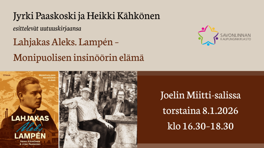 perjantaina 28. marraskuuta 2025Tervetuloa Savonlinnan pääkirjasto Joeliin torstaina 8.1. klo 16.30–18.30 kuuntelemaan unohdetun talousvaikuttajan tarinaa. Joelin Miitti-salissa tietokirjailijat Jyrki Paaskoski ja Heikki Kähkönen esittelevät tuoretta kirjaansa Lahjakas Aleks. Lampén – Monipuolisen insinöörin elämä (Otava, 2025).