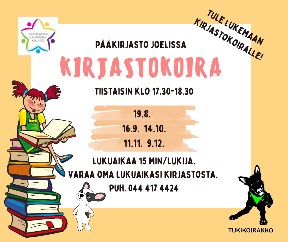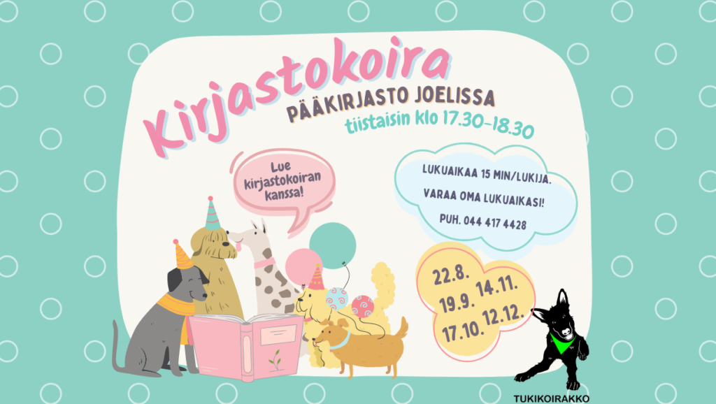 Kirjastokoirat ovat ihan oikeita koiria, jotka vierailevat pääkirjasto Joelissa kerran kuussa. Syksyn 2025 vierailupäivät ovat 19.8., 16.9., 14.10., 11.11. ja 9.12. Koirat kuuntelevat lukijoita Tilkku-tilassa klo 17.30-18.30. Koirille kannattaa varata etukäteen lukuaika, joka on 15 min/lukija. Tervetuloa!