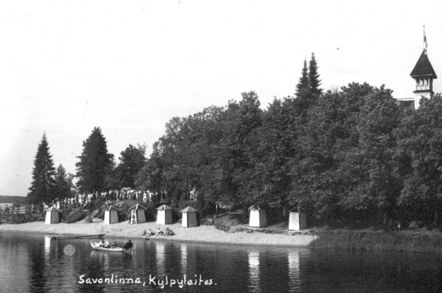Kuvassa kylpylaitoksen uimarantaa uimakoppeineen 1930–1940-luvulla – puiden takaa kohoaa toinen kylpylän goottilaismallisista torneista. Kuvaaja Sihvonen/Savonlinnan maakuntamuseo.