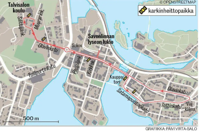 - Rekat kääntyvät Kirkkokadulta Olavinkadulle kohti Sokosta.