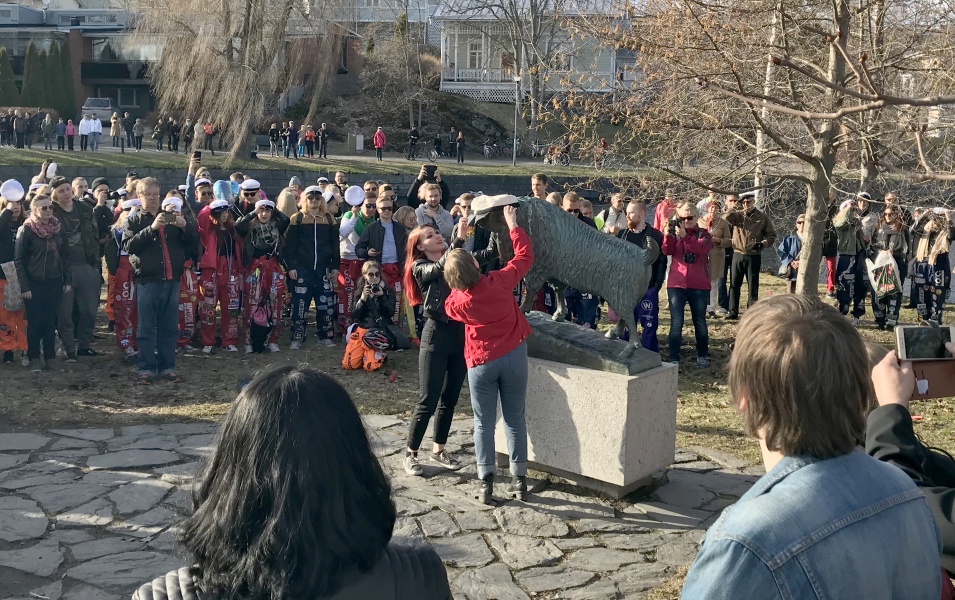 16:40 Vapputapahtuma alkaa Joel Lehtosen -patsaalta, johon molempien oppilaitosten opiskelijat kokoontuvat