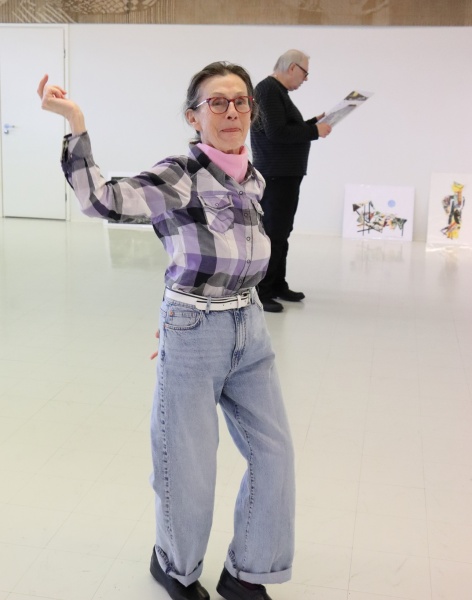 Kuva: Kaija-Leena Hänninen pisti ripustuksen lomassa tanssiksi. Taustalla ripustuksen suunnitteleva Raimo Paajanen.
