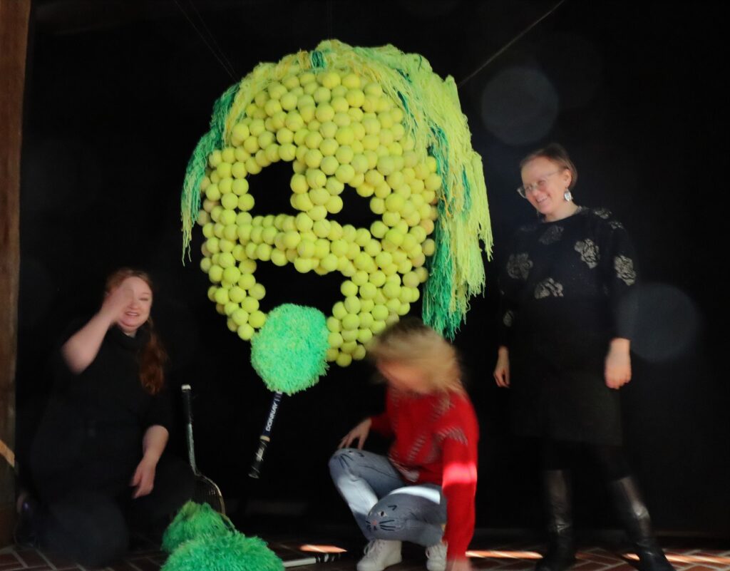 Venla Martikainen (oik.) teoksensa ”All work and no play makes me a dull boy”. Keskellä Tuija Teiska sekä vasemmalla Sunna Kangas.