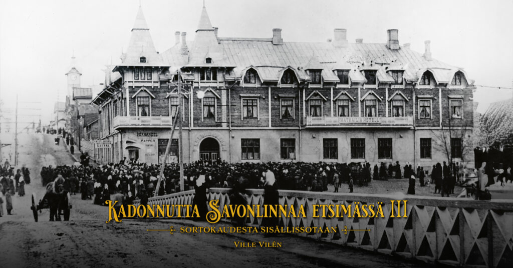 Ville Vilénin kirjoittama, Kimmo Heikkilän taittama ja Riihisaari – Savonlinnan museon kustantama ”Kadonnutta Savonlinnaa etsimässä III – Sortokaudesta sisällissotaan” kertoo Suomen historian poliittisesti levottomasta aikakaudesta, joka käynnistyi 1890-luvun lopulla ja päättyi sisällissotaan 1918. Savonlinnassa venäläistämistoimet, suurlakko, maailmansodan paine ja oman kansan verinen yhteenotto koettiin omalla tavallaan.