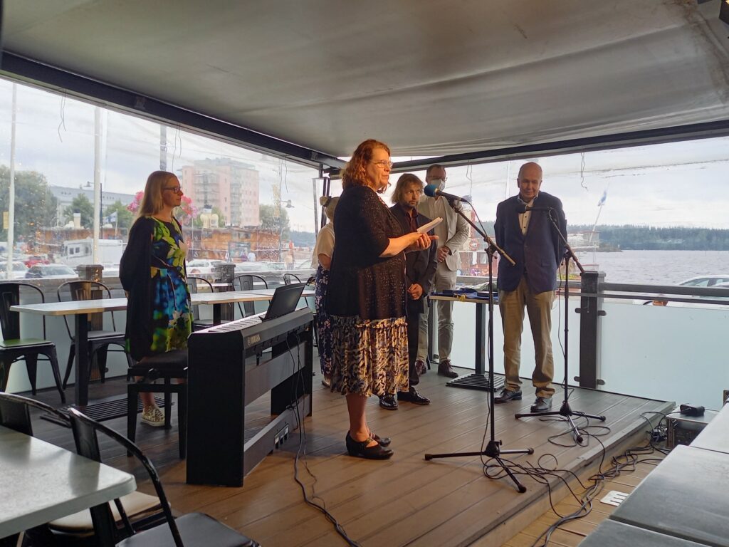 Savonlinnan kaupunginhallituksen puheenjohtajiston Kirsi Torikka ja Eija Stenberg sekä kaupunginvaltuuston puheenjohtaja Anna-Kristiina Mikkonen ja kaupunginjohtaja Janne Laine luovuttivat Savonlinna-mitalit torstaina 29.7. Pyhän Olavin päivän avauksessa Ravintola Waahdon terassilla.