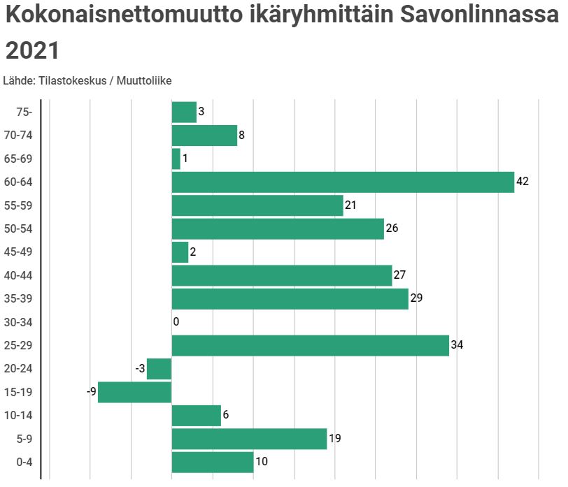 perjantaina 17. kesäkuuta 2022Savonlinna saavutti vuonna 2021 suurimman muuttovoittonsa koko 2000-luvulla. Suurin nettomuuttovoitto kohdistui 0-59-vuotiaisiin ollen +183 henkilöä. Koko nettomuuttovoitto oli Savonlinnassa +216 henkilöä. Esimerkiksi 25-29-vuotiaissa nettomuuttovoitto oli +34 ja 0-14- vuotiaissa +35 henkilöä. Yli 75-vuotiaissa muuttovoitto oli vain +3 henkilöä. Savonlinnaan muutettiin eniten Helsingistä ja muista pääkaupunkiseudun kunnista sekä Joensuusta ja Lappeenrannasta.