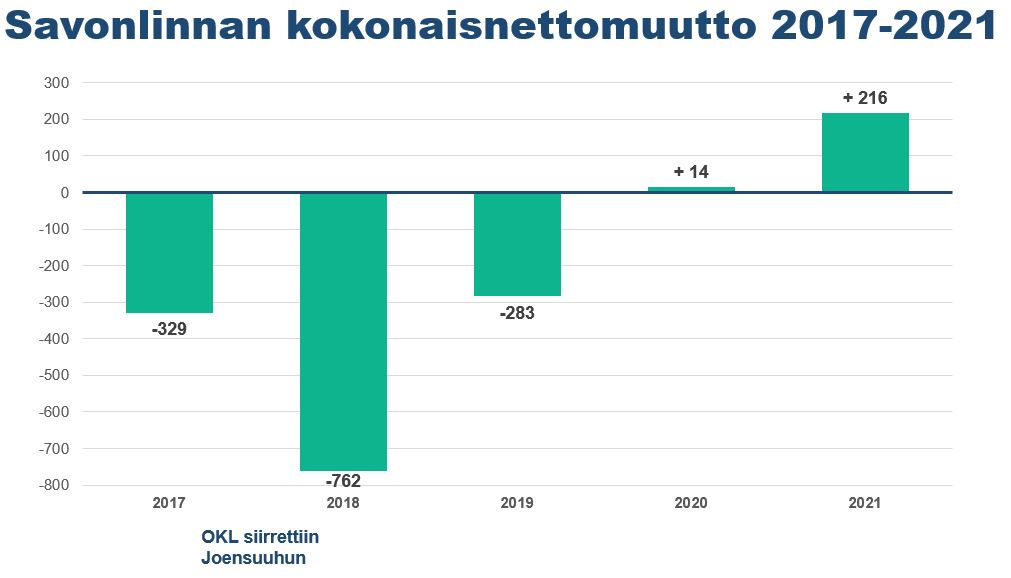Savonlinna menetti vuosina 2017-2019 muuttotappiona -1 374 henkilöä, johtuen opettajakoulutuksen siirtymisestä Joensuuhun. Vuonna 2020 muuttoliike kääntyi positiiviseksi, jolloin kokonaisnettomuutto oli plussalla 14 henkilöä. Koko Etelä-Savon osalta kokonaisnettomuutto oli -405 henkilöä vuonna 2020.