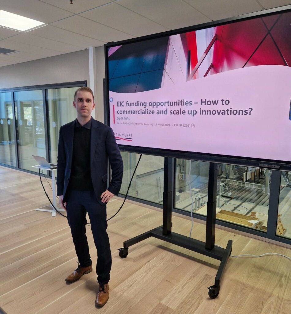 Koulutuksen teemoina olivat EIC-ohjelmakokonaisuuteen ja hakemusten laadintaan liittyvät asiat. Lisäksi osallistujilla oli mahdollisuus saada sparrausta omille hankeideoille. ”Kävimme läpi esimerkiksi mikä on oikea hetki, milloin kannattaa lähteä hakemusta viemään eteenpäin. Rahoitushakuja kannattaa kartoittaa hyvissä ajoin, jotta hakemuksen valmisteluun pystyy varaamaan riittävästi aikaa ja resursseja. Mikäli ei halua lähteä vetämään omaa EU-hanketta, on myös mahdollisuus osallistua konsortioihin ja sitä kautta päästä mukaan eurooppalaisiin innovaatioverkostoihin”, kertoo kouluttajana toiminut Janne Kaukojärvi. Hän työskentelee liiketoiminnan kehityspäällikkönä Spinversellä, joka on keskittynyt innovaatiokonsultointiin.