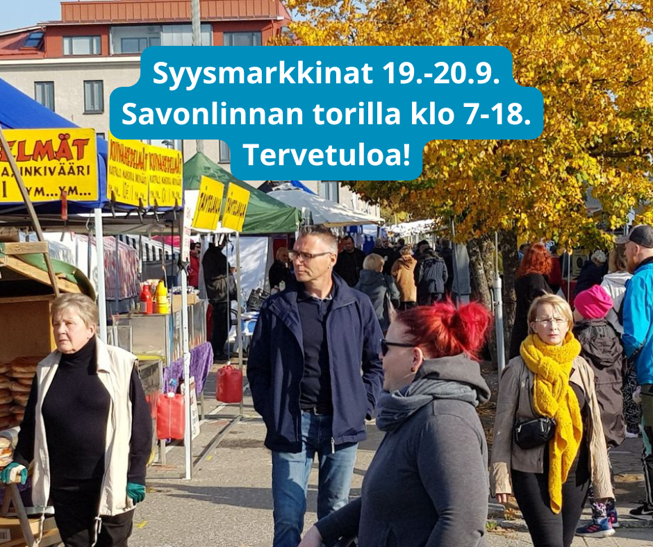 tiistaina 16. syyskuuta 2025Syysmarkkinat järjestetään 19.–20.9. Savonlinnan kauppatorilla klo 7–18. Tarjolla on laaja kattaus herkkuja, kuten muikkuja, lörtsyjä, kebabeja, makeisia, marjoja ja hunajaa. Lisäksi myynnissä on kukkia, käsitöitä, rottinkikalusteita ja paljon muuta!
