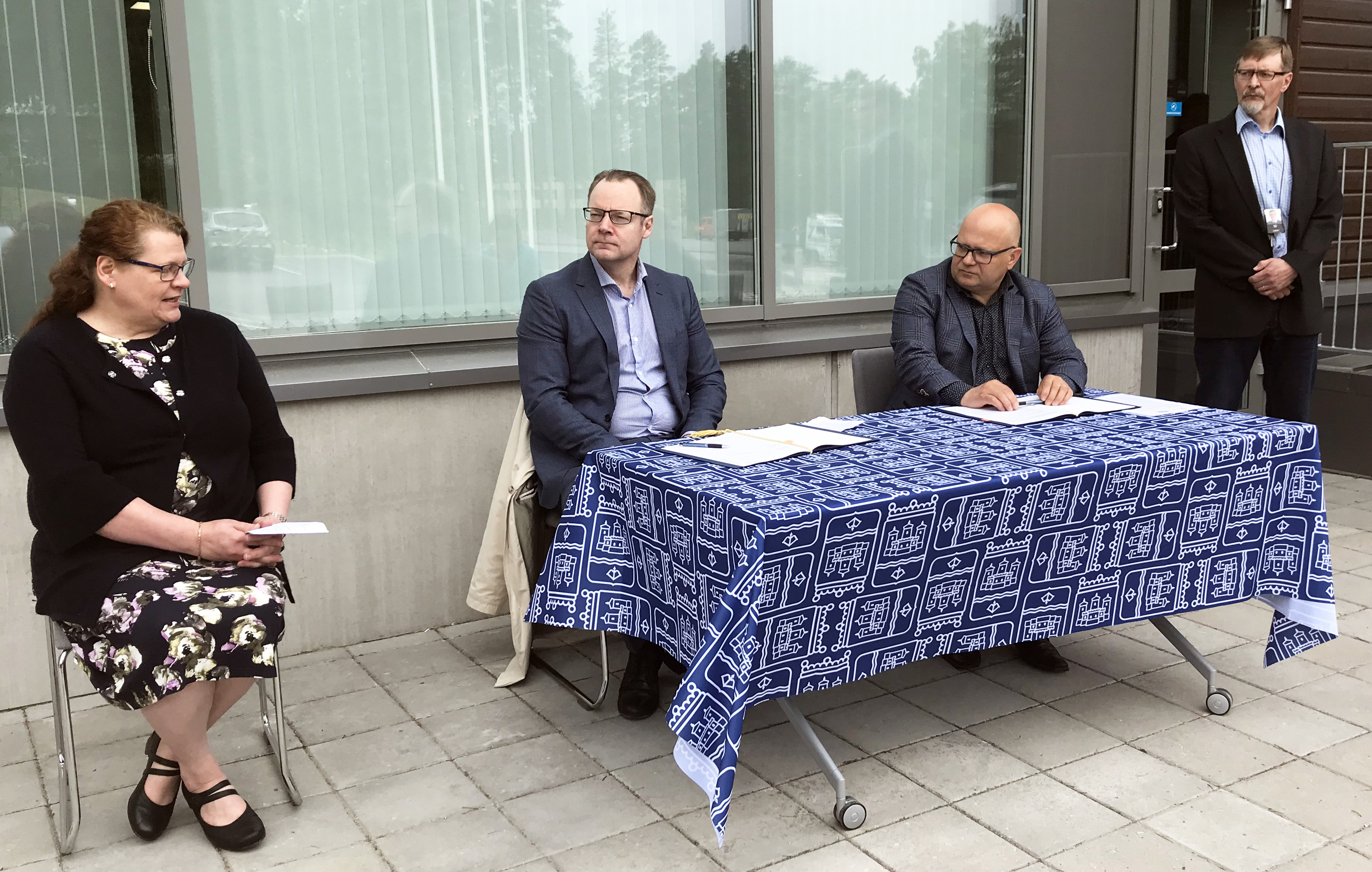 Aiesopimuksen allekirjoitustilaisuus järjestettiin teknologiapuistossa 11.6. Paikalla olivat kaupunginhallituksen puheenjohtaja Kirsi Torikka, kaupunginjohtaja Janne Laine, Xamkin hallituksen puheenjohtaja Jyrki Koivikko ja Xamkin kuitulaboratorion johtaja Tapio Tirri.