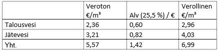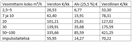 perjantaina 19. joulukuuta 2025Tekninen lautakunta on päättänyt korottaa perusmaksuja 25 % ja käyttömaksuja 7 % 1.1.2026 alkaen. Perusmaksu määräytyy kiinteistön vesimittarin koon perusteella (euroa/vuosi).