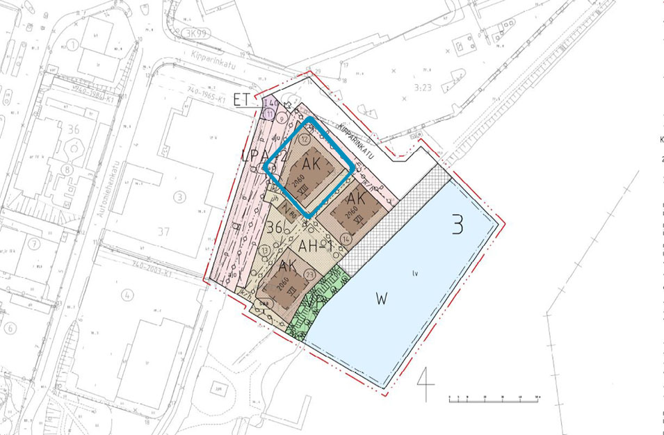 Kuva: Asemakaavaan merkitty suunnitellun rakennuksen tontti sinisellä kehyksellä