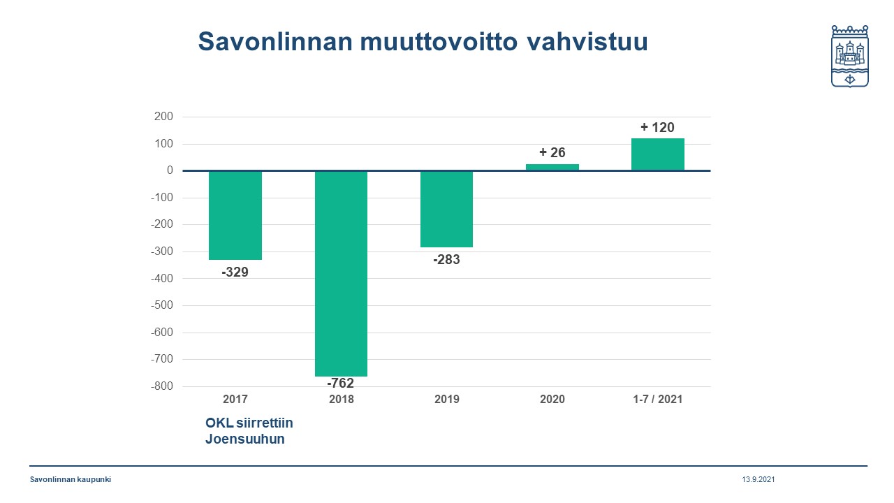 – Savonlinnassa on menossa vahva kehitysvaihe, toimenpiteet jotka käynnistettiin OKL:n siirtopäätöksen jälkeen purevat. Savonlinna nousi muuttovoittokaupungiksi viime vuonna ja muuttovoitto on vahvassa kasvussa tänäkin vuonna. Heinäkuun tilastossa olimme jo 120 asukasta plussalla. Samoin työllisyystilanne on koronan aiheuttaman nousupiikin jälkeen parantumassa vinhaa vauhtia. Ammattikorkeakoulukampuksen opiskelijamäärä on kaksinkertaistumassa 1.400 opiskelijaan, teknologiapuiston laajentuminen jatkuu, Parikkalan rajanylityspaikka on kansainvälistymässä, metsäliitto teki 50 miljoonan kertopuutehdasinvestoinnin, samoin UPM teki investointeja Savonlinnaan. Myönteinen kehitys näkyy nyt myös vuokra-asuntojen kysynnän kasvuna kaupunkikeskustan alueelle, josta syystä on tärkeää saada vuokratalojen investointihanke eteenpäin, toteaa kaupunginjohtaja Janne Laine.