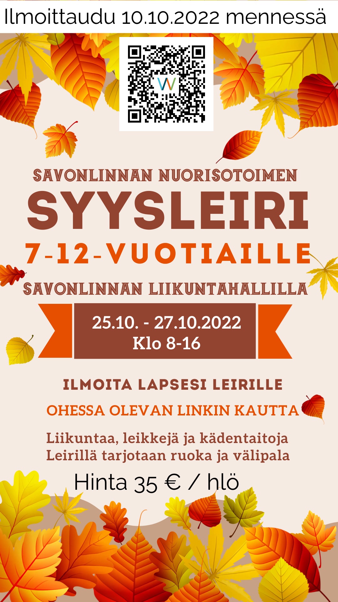 Savonlinnan nuorisotoimi järjestää syyslomaviikolla Syysleirin 7-12 -vuotiaille. Leiri järjestetään Savonlinnan liikuntahallilla tiistaista torstaihin, 25.-27.10.2022 klo 8-16.
