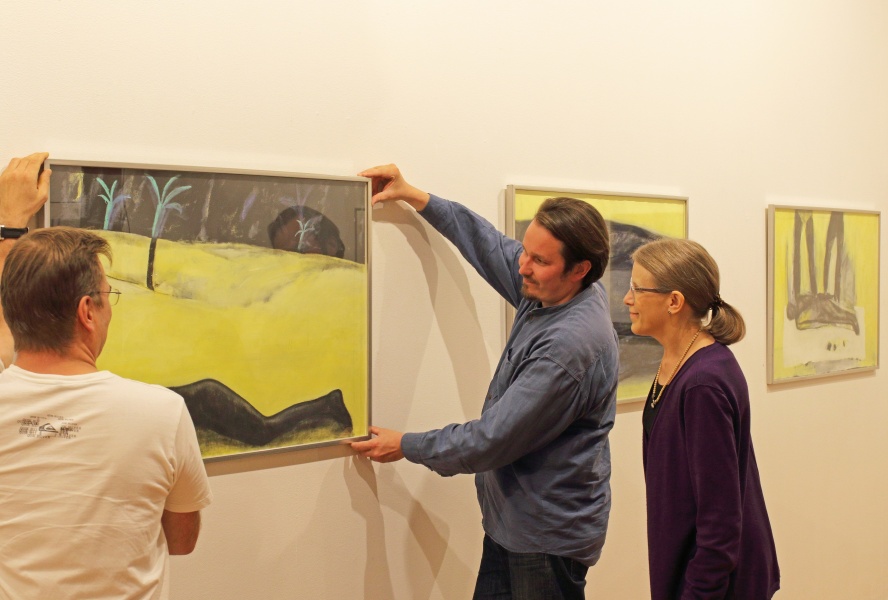 Kuvassa museoamanuenssi Anssi Taskinen, museonjohtaja Nikke Kaartinen ja intendentti Kirsi Liimatainen ripustamassa Marita Liulian teosta Sahara (1987 akryyli/pastelli).