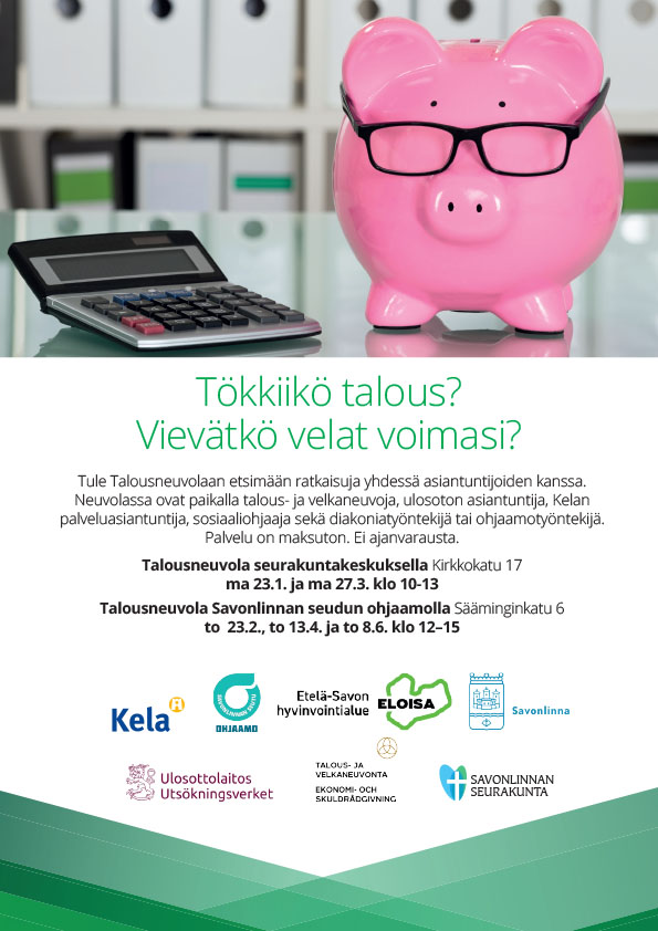 maanantaina 9. tammikuuta 2023Savonlinnassa jo tutuksi tullut Talousneuvola jatkuu tammikuussa 2023. Talousneuvolan asiantuntijat ovat tavattavissa Savonlinnan Seudun Ohjaamolla (Sääminginkatu 6) tai Savonlinnan seurakuntakeskuksella (Kirkkokatu 17) kerran kuukaudessa. Talousneuvolassa pääsee juttelemaan talouteen liittyvistä asioista anonyymisti ilman ajanvarausta. Talousneuvolaan voi tulla yksin tai yhdessä oman työntekijän tai tukihenkilön kanssa.