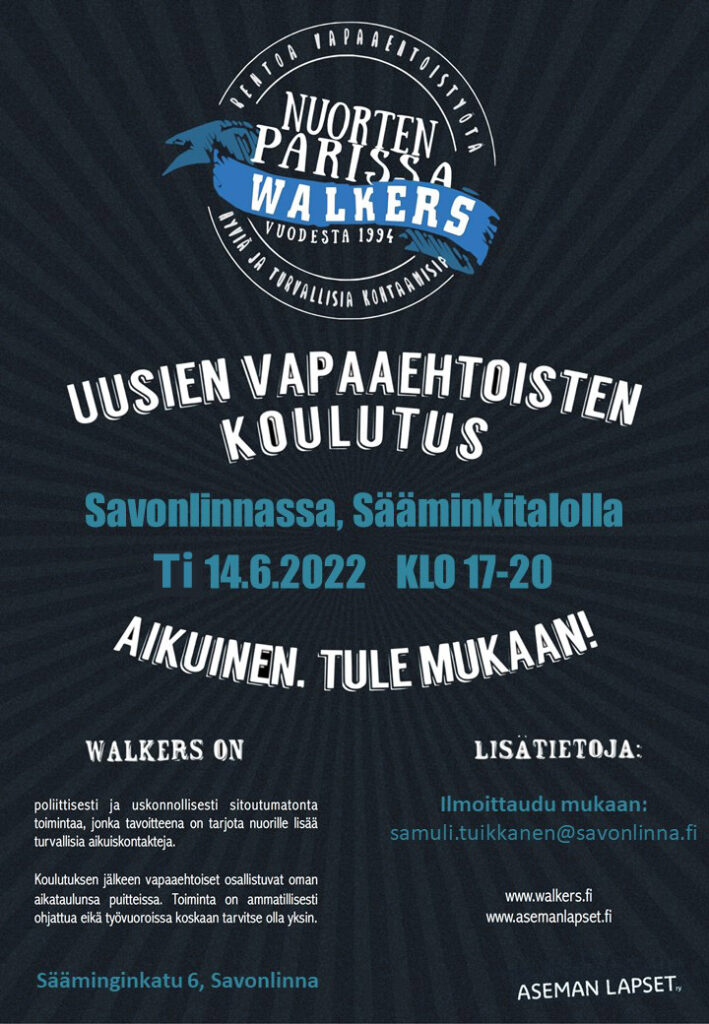 keskiviikkona 25. toukokuuta 2022Tule mukaan Walkers-vapaaehtoiseksi nuorisotoimintaan! Uusi koulutus vapaaehtoistoimintaan järjestetään tiistaina 14.6.2022 klo 17-20 Sääminkitalolla.
