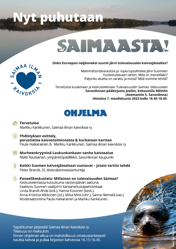 Tapahtuman järjestää Saimaa ilman kaivoksia ry. Tilaisuus on maksuton.