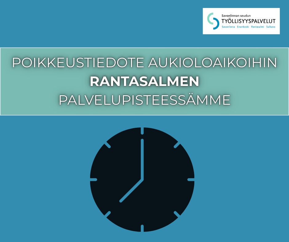 Keskiviikkona 6.8.2025 Rantasalmen palvelupisteemme sekä kunnanvirasto on poikkeuksellisesti auki klo 9.00-11.00 henkilöstön koulutuspäivän vuoksi.