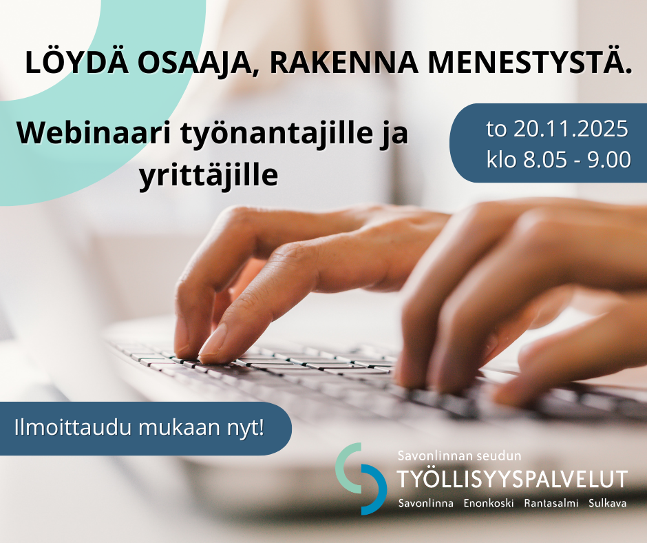 torstaina 30. lokakuuta 2025Savonlinnan seudun työllisyyspalvelut kutsuu alueen yrittäjät mukaan maksuttomaan webinaariin, jossa saat konkreettisia keinoja osaavan työntekijän löytämiseen ja yrityksesi kasvun tukemiseen.