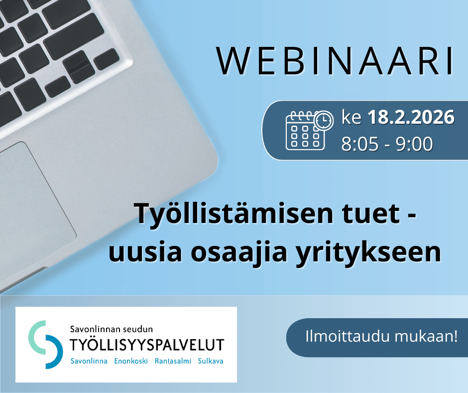 keskiviikkona 14. tammikuuta 2026Työllistämisen tuet avaavat työnantajille uusia mahdollisuuksia rekrytointiin. Maksuttomassa webinaarissa kuulet, miten erilaiset tukimuodot voivat tuoda yritykselle konkreettisia hyötyjä ja madaltaa kynnystä palkata uusia osaajia. Asiantuntijamme esittelevät nuorten työllistämissetelin, kuntalisän ja palkkatuen sekä antavat selkeät ohjeet tukien hakemiseen ja tehokkaaseen hyödyntämiseen.