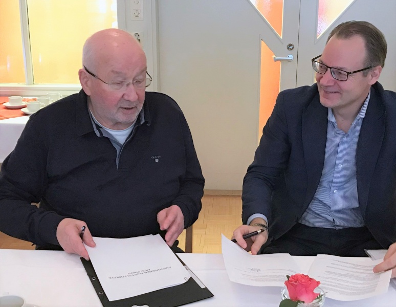 Kuva: Savonlinnan kaupunki. Liikemies Yrjö Laakkonen sekä Savonlinnan kaupungin kaupunginjohtaja Janne Laine aiesopimuksen allekirjoitustilaisuudessa 17.12.2018.